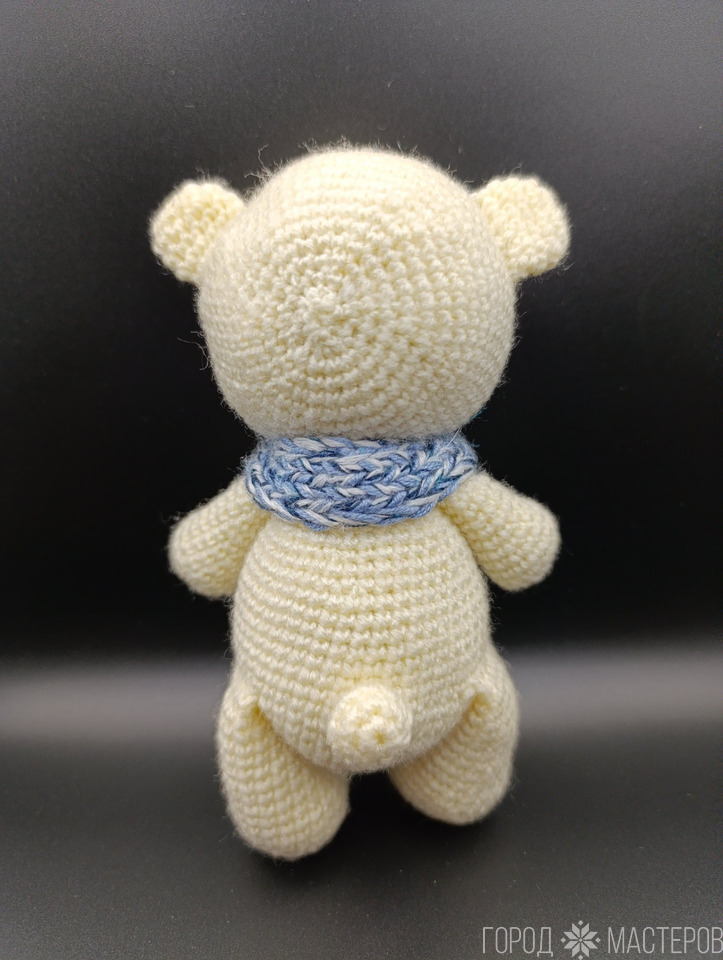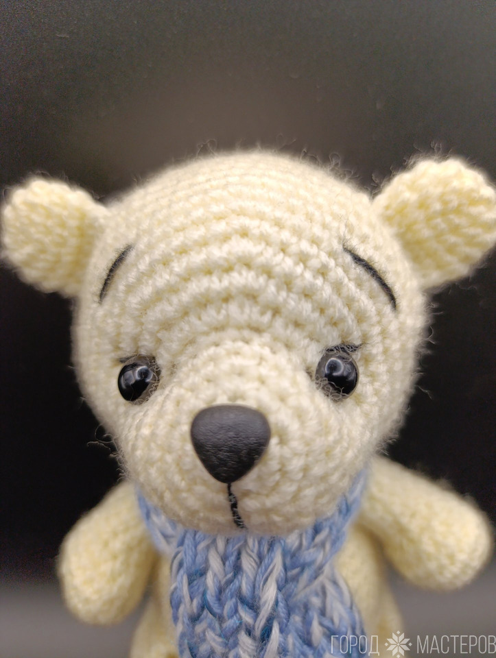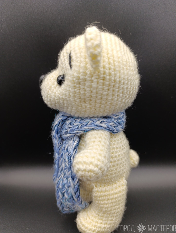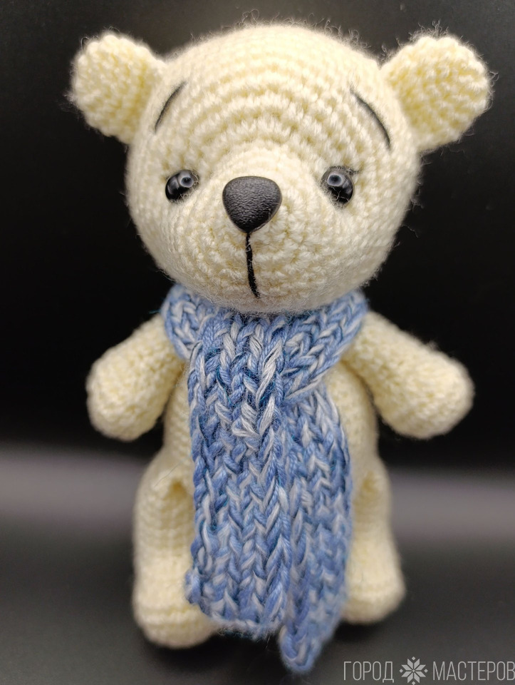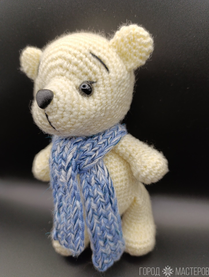 Игрушка вязаная, высота 14 см, акрил, холофайбер, глаза и нос на безопасном креплении. Шарф снимается.