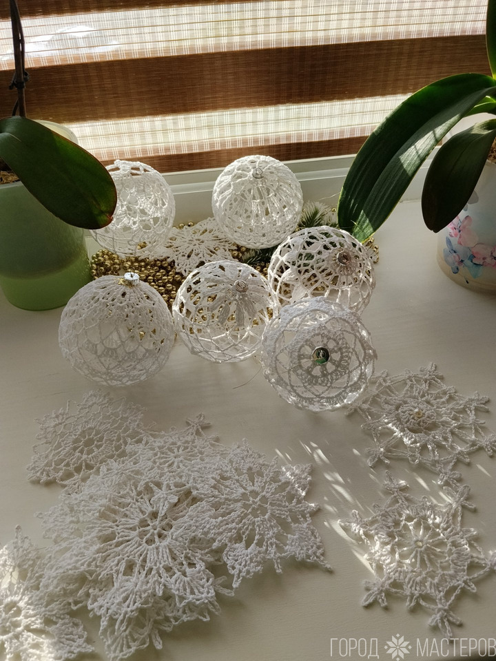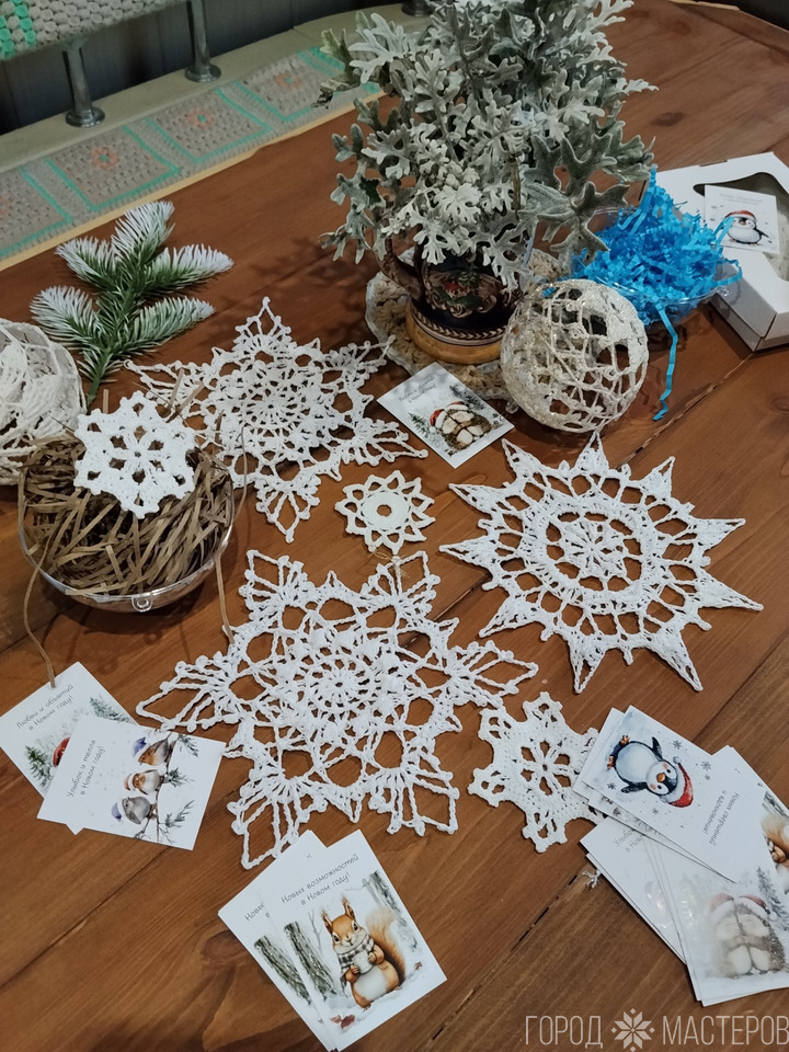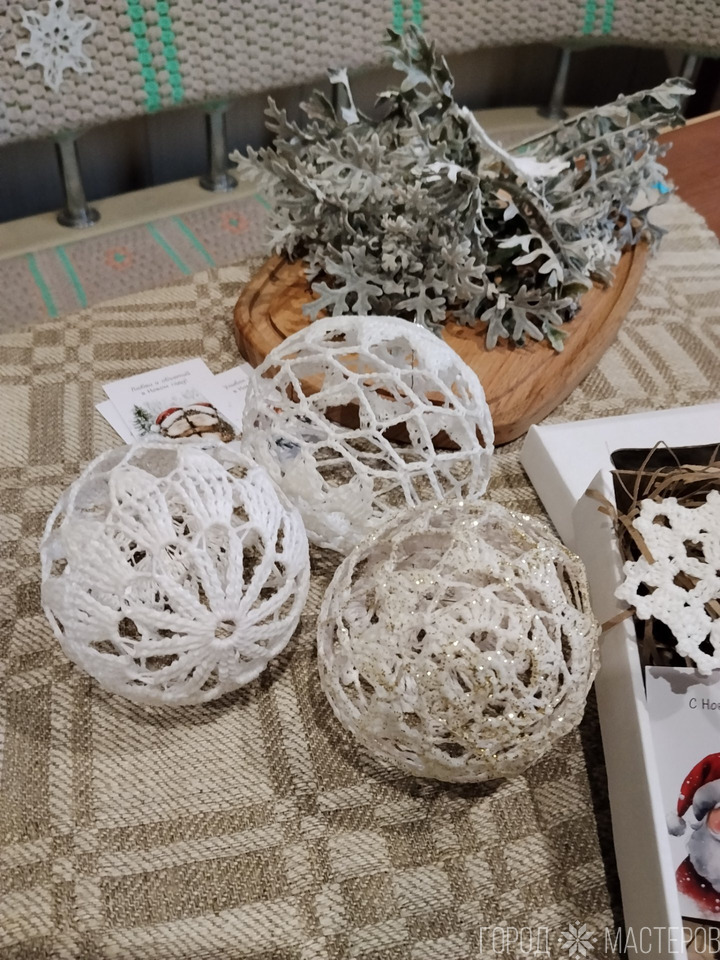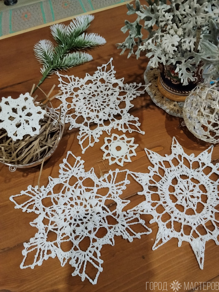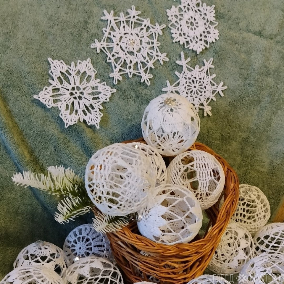 Ажурные снежинки и объёмные шары, связанные крючком, подчеркнут атмосферу Рождественского праздника и домашнего уюта. Удобно разместятся на ёлке и удачно выступят в роли новогоднего декора. Также это великолепный подарок для ценителей ручной работы. Соберу любой набор по индивидуальному заказу .