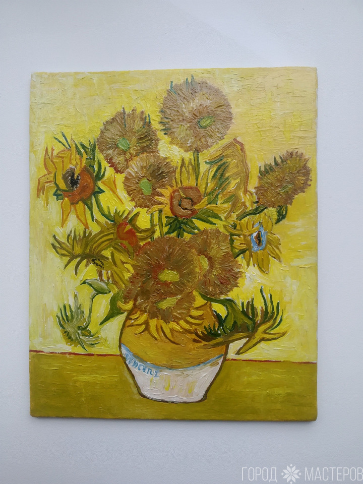 Мини копия картины Винсента Ван Гога Подсолнухи: холст (х/б) на двп, масло, размер 13см х 16см, с обратной стороны есть краткое описание картины и магниты.